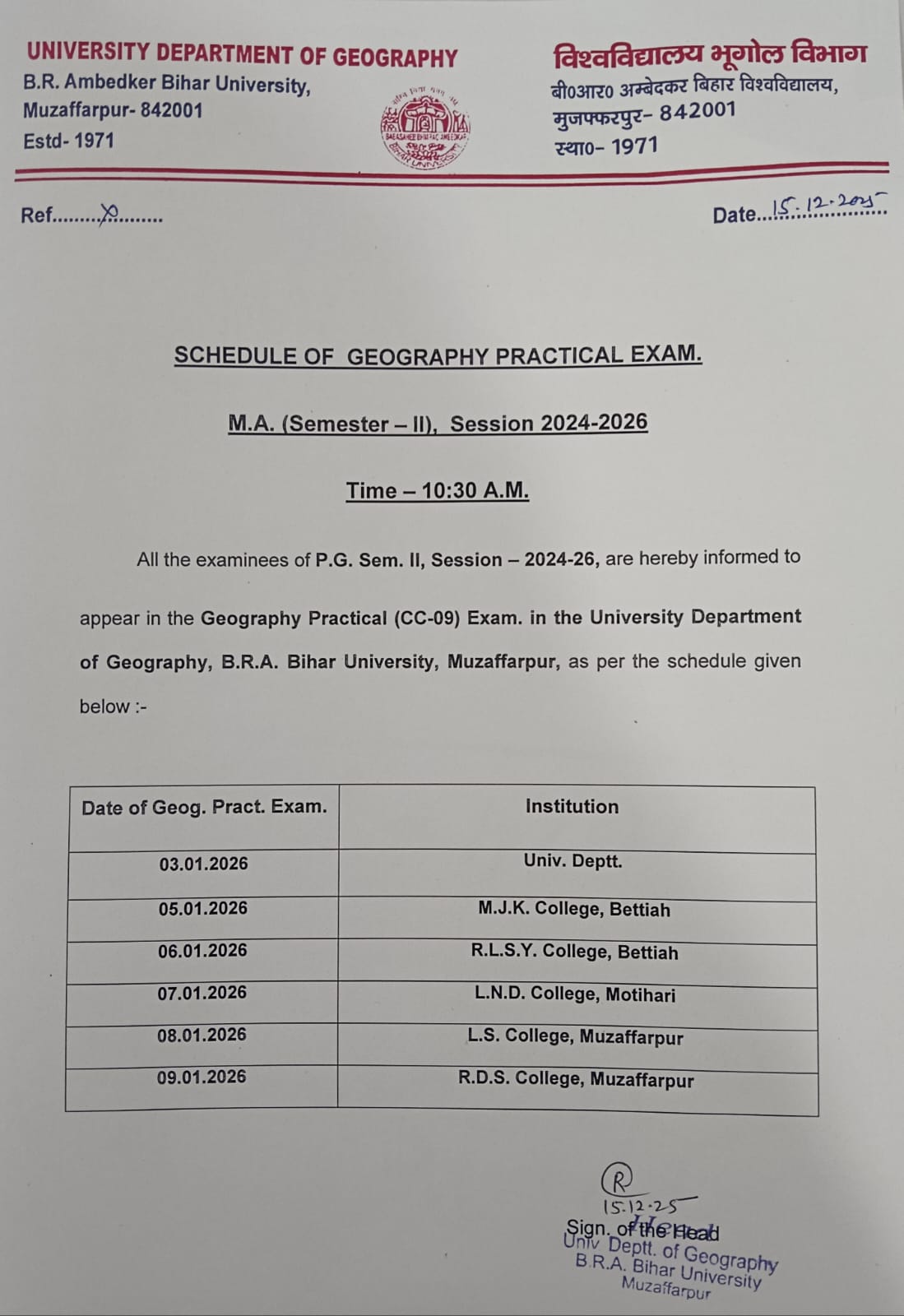 University Department of Geography at Post-Graduate level was at first established in 1971 at R.D.S. College, Muzaffarpur campus under the dynamic educational performance of Prof. (Dr.) Pratap Sinha. Since then, there was ten sanctioned teaching positions and the number of seats for admission was only twenty-four. After some time the Department was brought in the University Campus. The number of students started increasing with the passage of time. Teaching activities went on progress regularly. Just after some time Prof. (Dr.) Adya Saran was transferred from Patna University to Bihar University, Muzaffarpur and he was appointed as the Head of the Department from 10.09.1971 to 30.11.1982. After his superannuation, Prof. (Dr.) Pratap Sinha was again appointed as the Head of the Department. Prof. (Dr.) Pratap Sinha wrote a book entitled "Geomorphology" and he was succeeded by Prof. (Dr.) T.N.S. Singh, Prof. (Dr.) J.P. Sharma, Prof. (Dr.)Bharat Prasad Mishra, Prof. (Dr.) S.N. Kumar, Prof. (Dr.) P.K. Mishra, and Prof. (Dr.) Kamlesh Prasad. After Dr. Prasad Prof. (Dr.) Muneshwar Singh, Head Department of Geography, Nitishwar Mahavidyalay, Muzaffarpur was appointed as the Head of University Department of Geography, B.R.A.B.U., Muzaffarpur. After his superannuation Dr. J.N. Mishra from R.D.S. College, Muzaffarpur, Dr. K.L. Manjhi from R.C. College, Sakra, Dr. Uma Shankar Singh from Dr. R.L.M.S. College Muzaffarpur, Prof. (Dr.) Ram Pravesh Yadav and Prof. (Dr.) Md. Jafar Imam was appointed as the Head of the university Department of Geography, B.R.A.B.U, Muzaffarpur. After that Prof. (Dr.) Rupa Kumari, from University Department of Geography the present Head respectively was appointed as the Head. Syllabus based on semester system on CBCS pattern is running in the University Department of Geography since 2018-2020 session. Now, one Associate Professor Dr. Ida Ella Seema Kerkatta, three Sr. Assistant Professor Dr. Shirin Hayat, Miss. Mamta Roy and Miss. Indrani Roy are working in the University Department of Geography, B.R.A.B.U., Muzaffarpur.